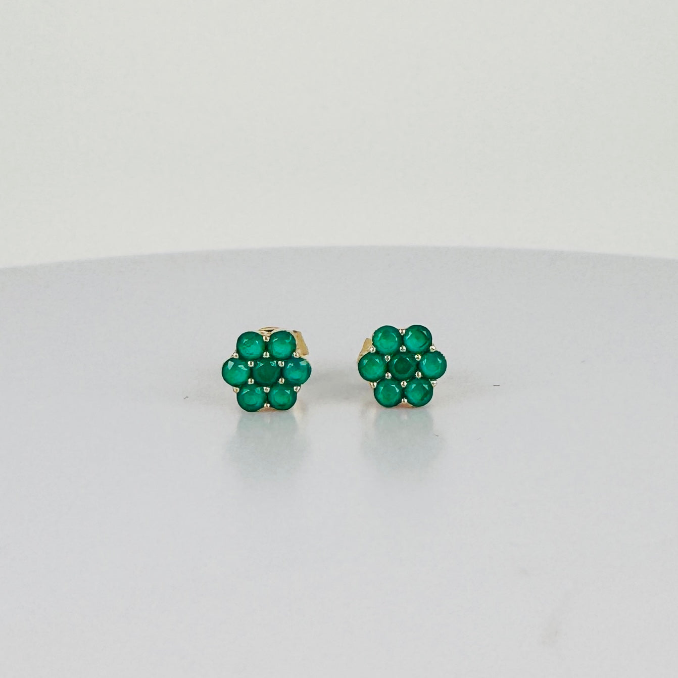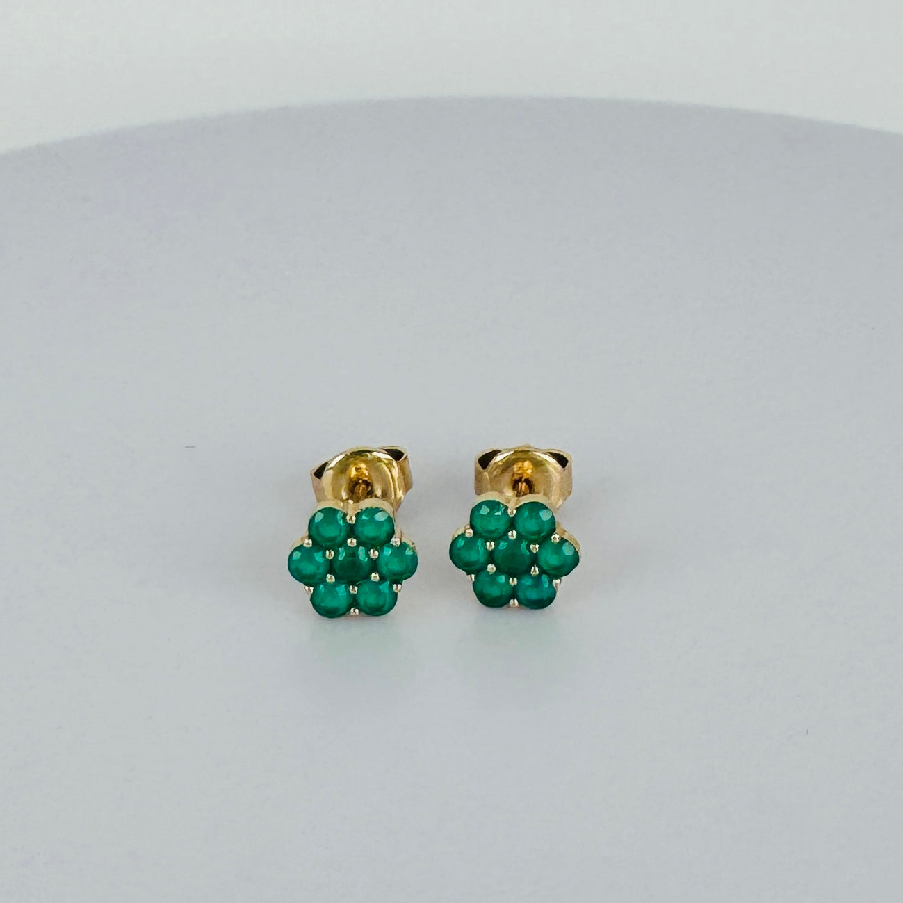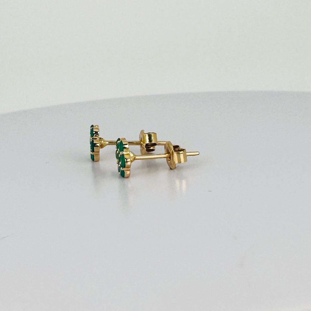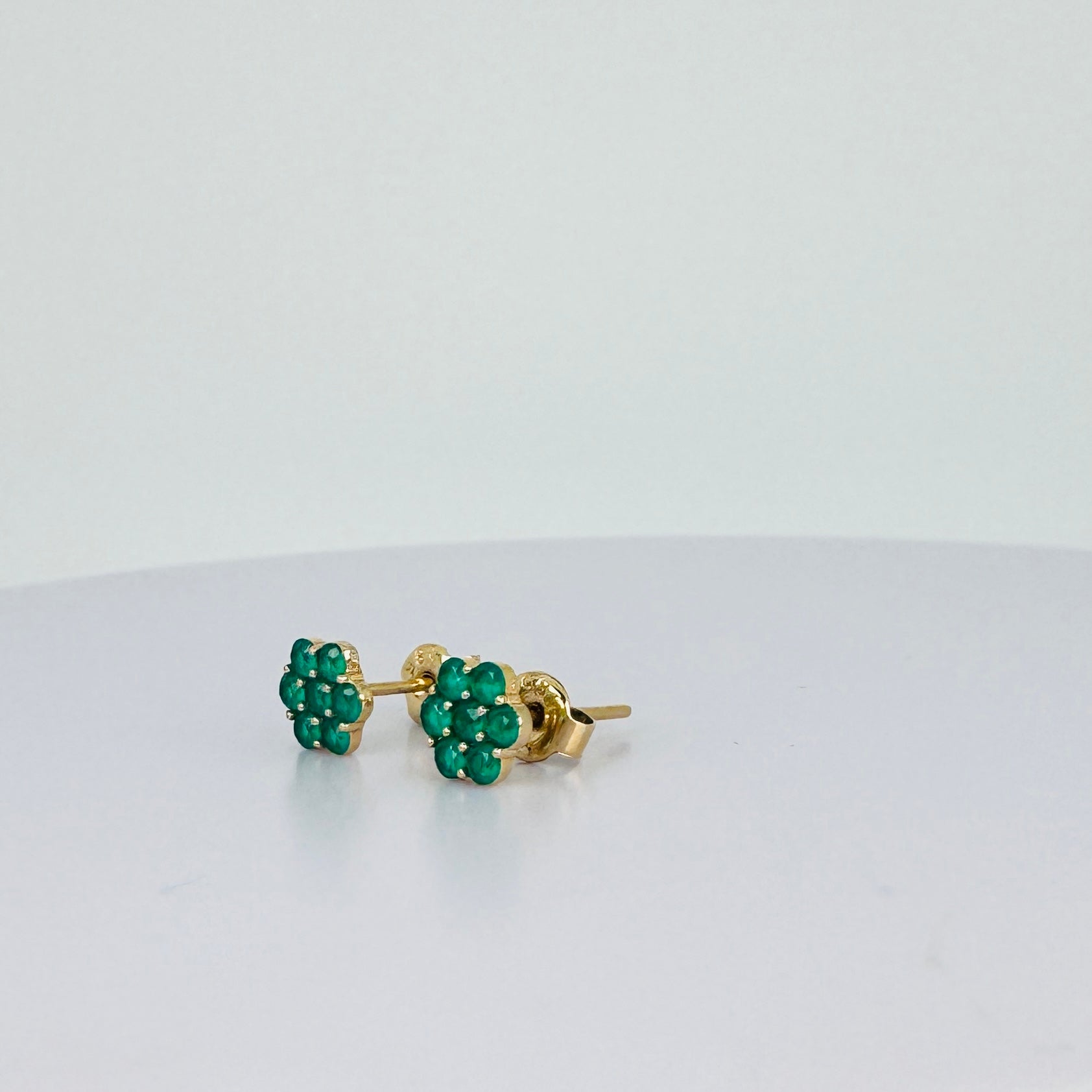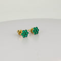 Add instant character to your look with these vintage gold flower-shaped earrings set with emeralds. Pre-loved and full of charm. These earrings give your outfit that little bit extra — effortlessly chic and full of personality.