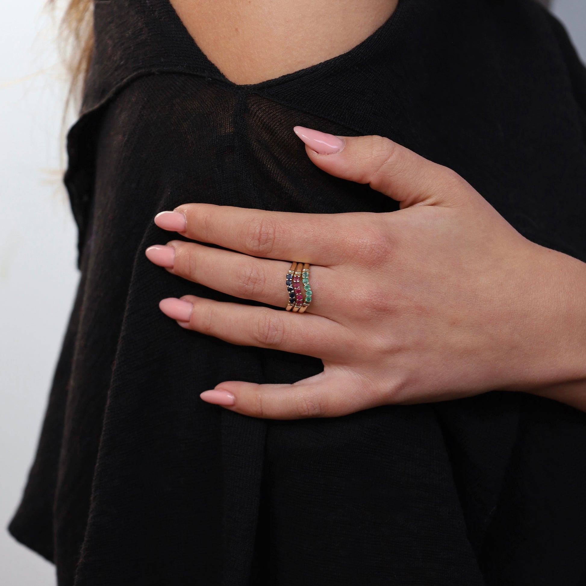 Discover this vintage chevron ring with stunning emeralds. Take a closer look at the design of this jewel! This ring can very well be worn alone, but can also be effortlessly stacked with other rings to create your personal look.