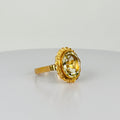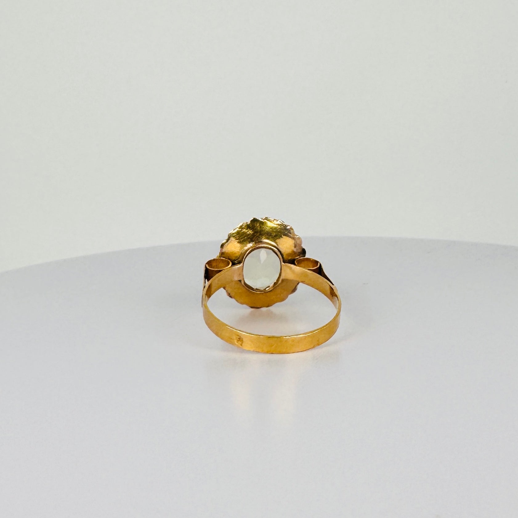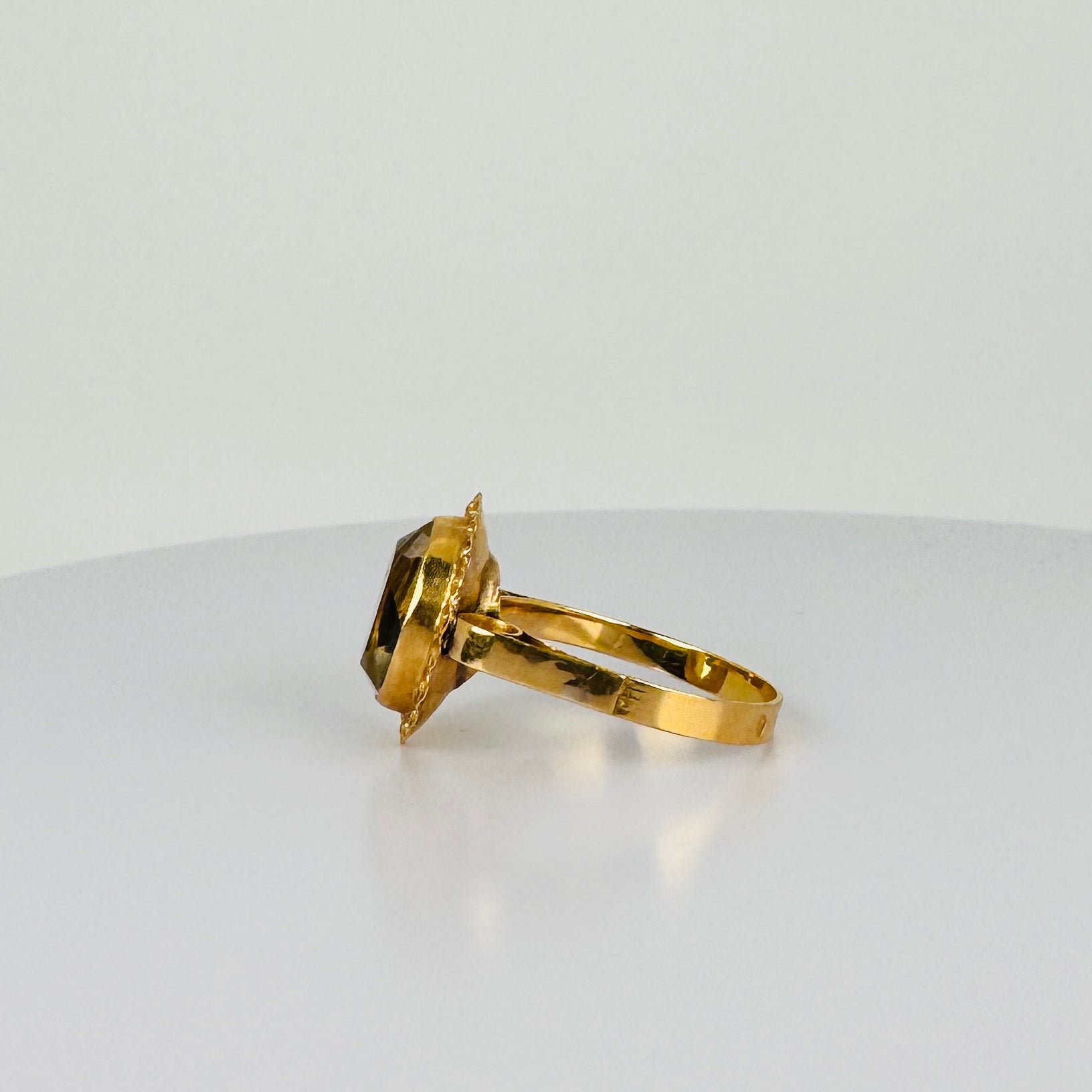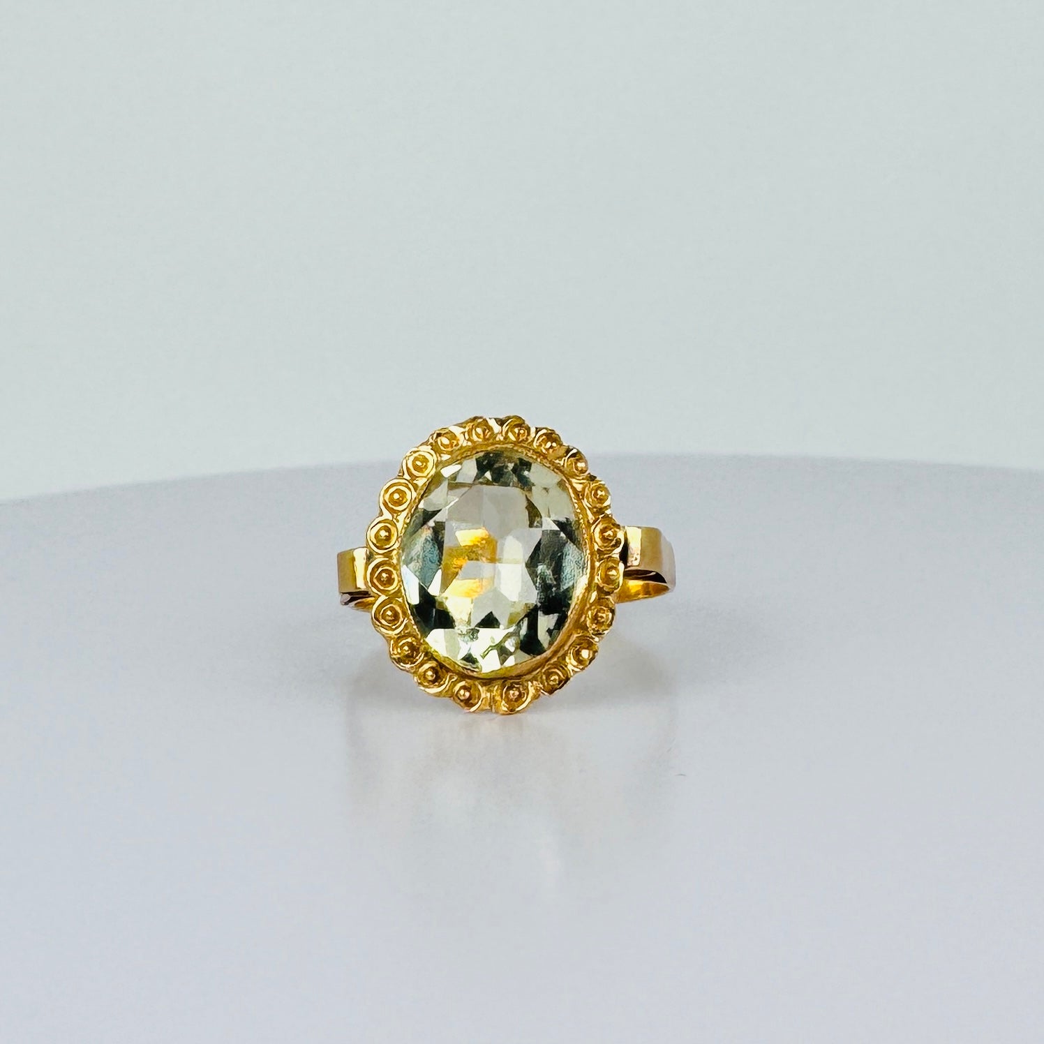 A beautifully balanced vintage ring in 18k yellow gold, set with an oval facetted gemstone of generous size. The elegant cut and classic setting make this piece effortlessly timeless.