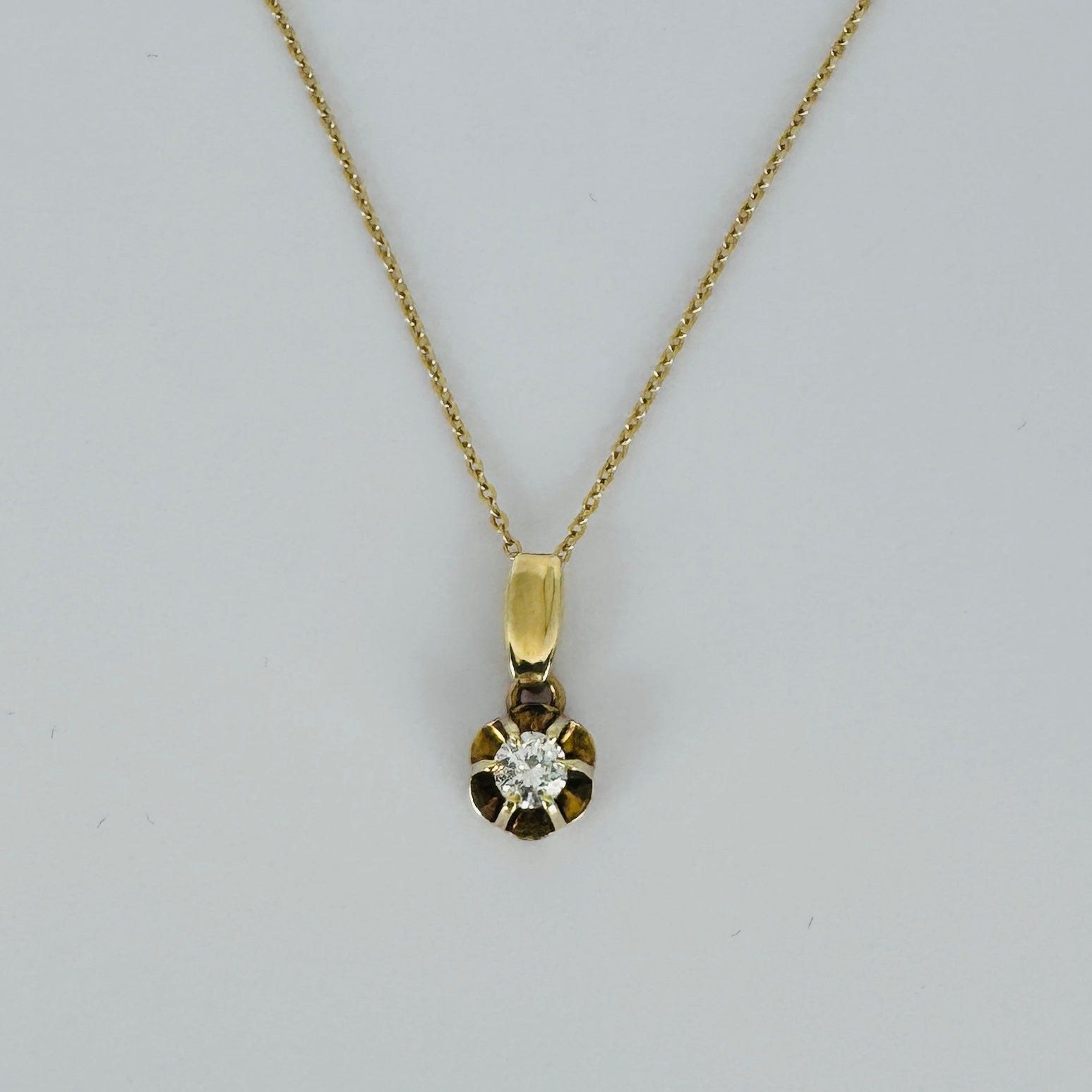 Een geelgouden vintage solitair hanger met een briljant geslepen diamant. Minimalistisch, verfijnd en zo ontworpen dat je dit pre-loved sieraad iedere dag kan dragen.