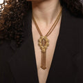 Een vintage Crown Trifari lariat ketting uit de jaren ’60 met klasse. Goud verguld en ontworpen met een verfijnd knoopdetail. Dit sieraad is subtiel in haar beweging en prachtig in uitstraling.