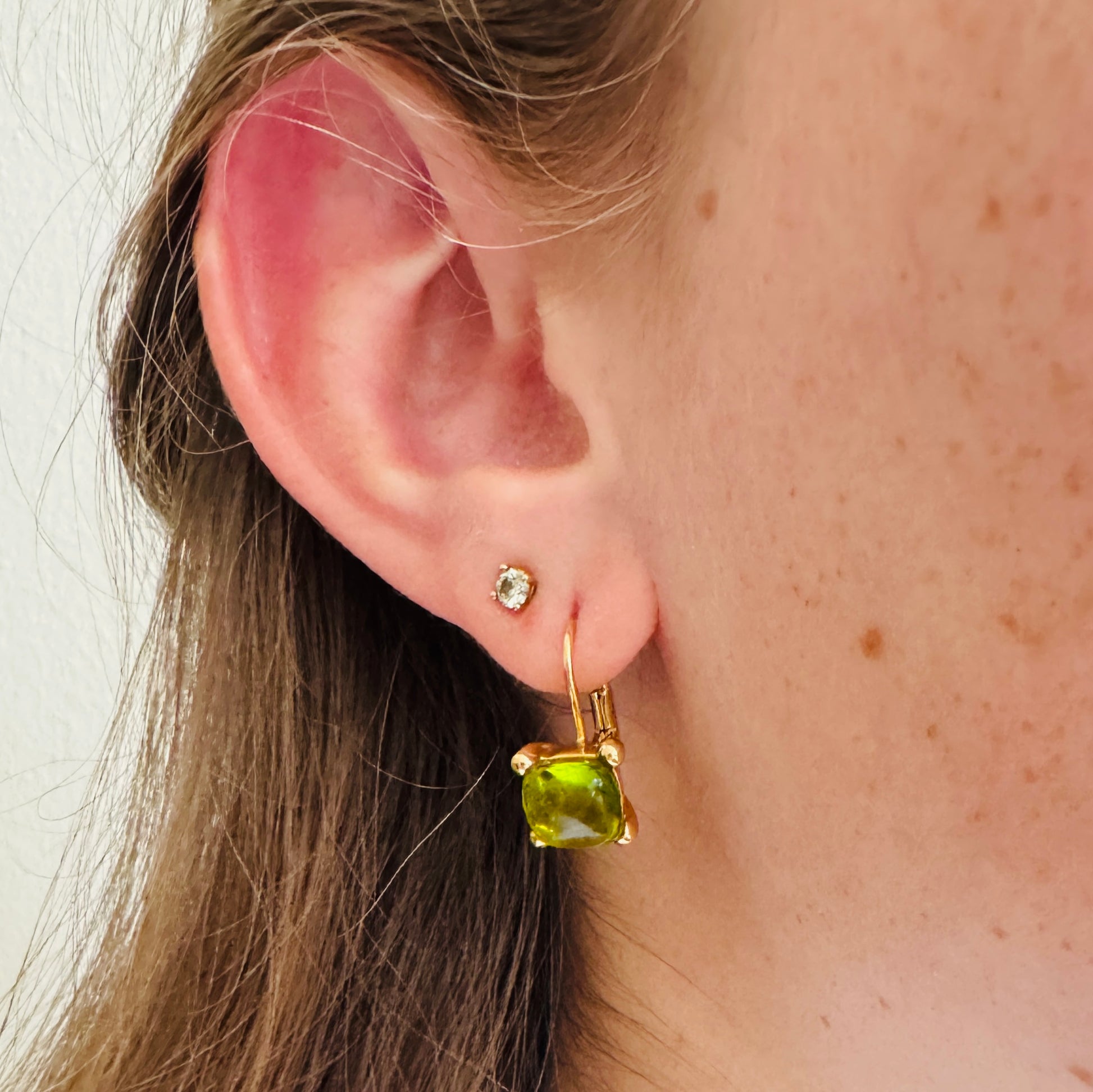 Durf te schitteren met deze prachtige dubbele oorbellen, versierd met prachtig groen glas. Of je je nu opmaakt voor een speciale gelegenheid of je dagelijkse look wilt opfleuren, deze oorbellen zijn echte blikvangers.