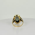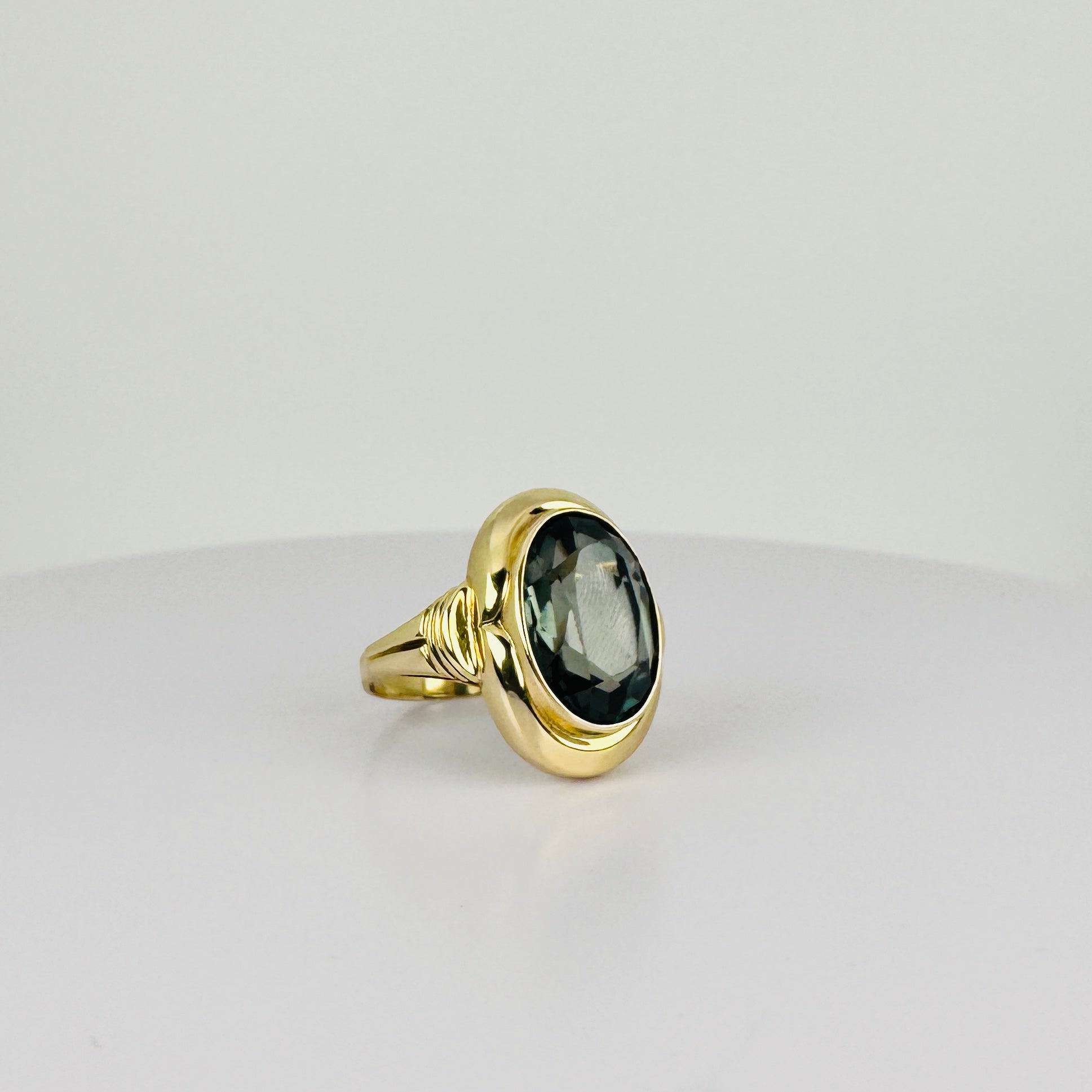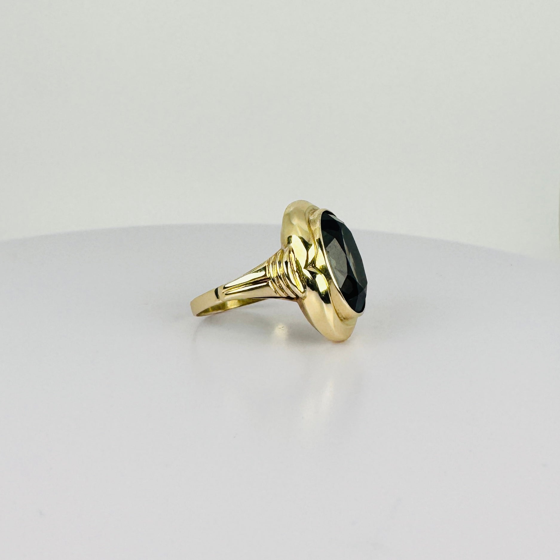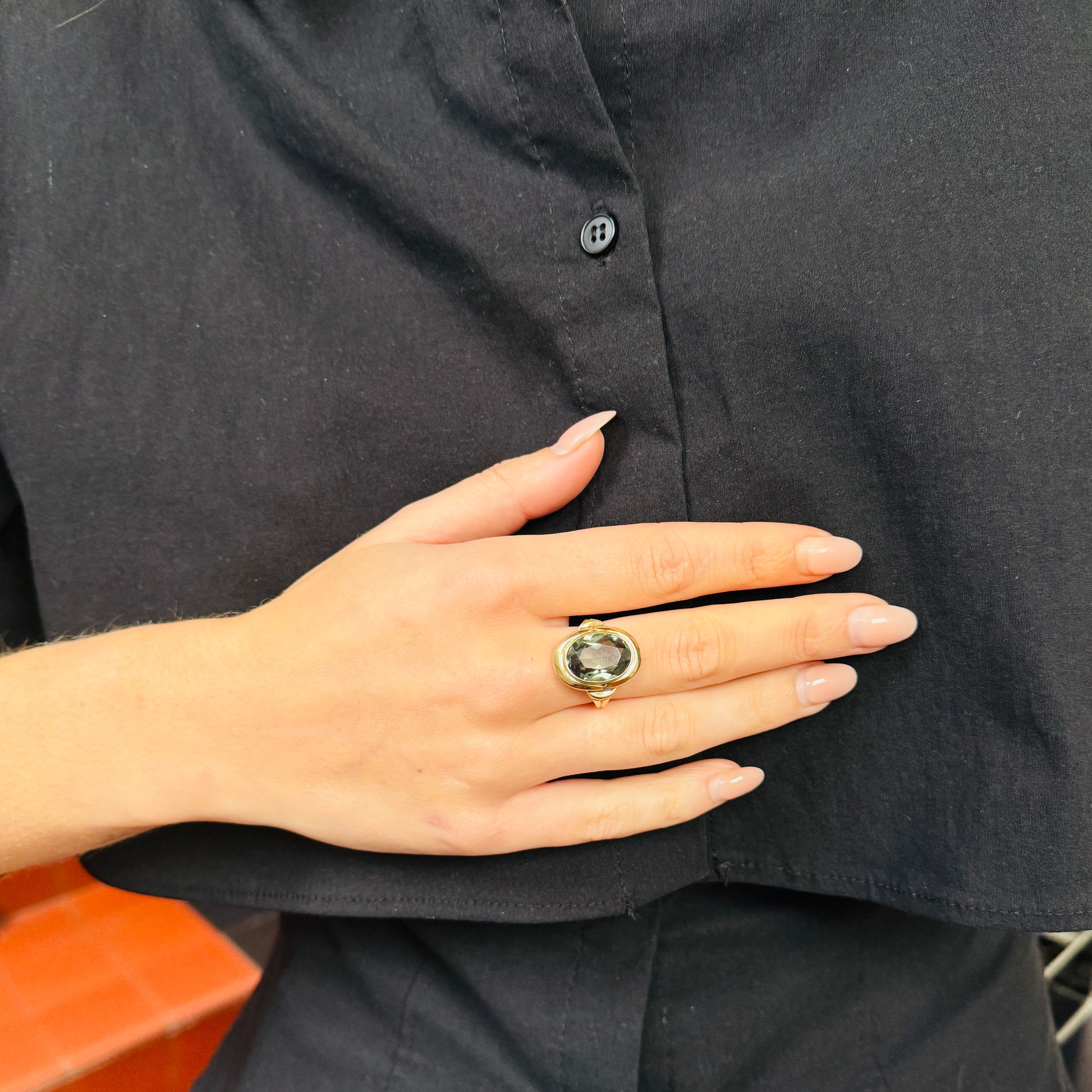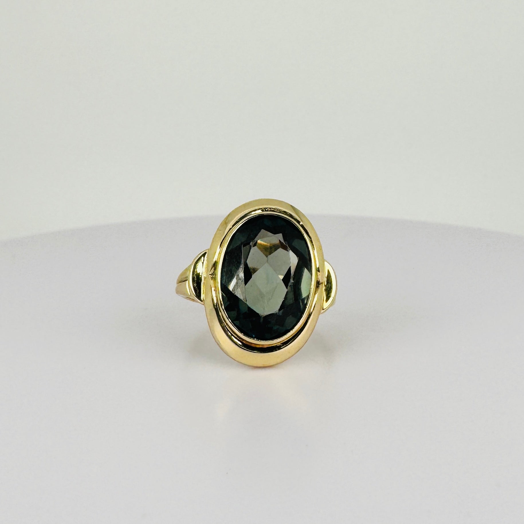 Dit sieraad straalt elegantie en verfijning uit! Deze gouden ring is voorzien van een ovale toermalijn, omringd door subtiel 14-karaats goud. Dit sieraad heeft een tijdloos ontwerp dat moeiteloos bij iedere look en gelegenheid past.