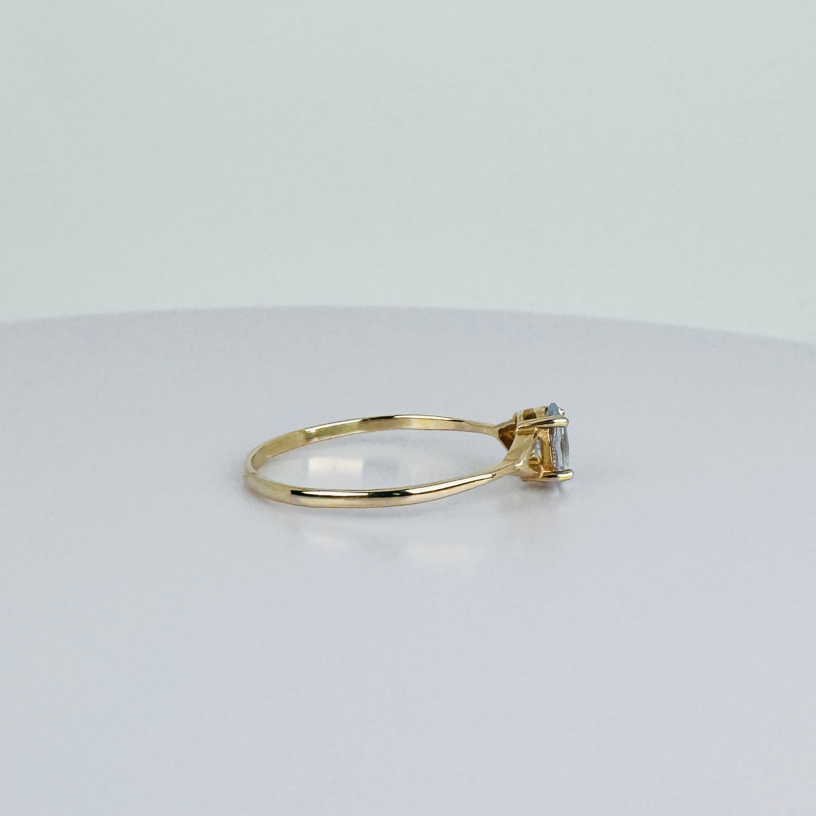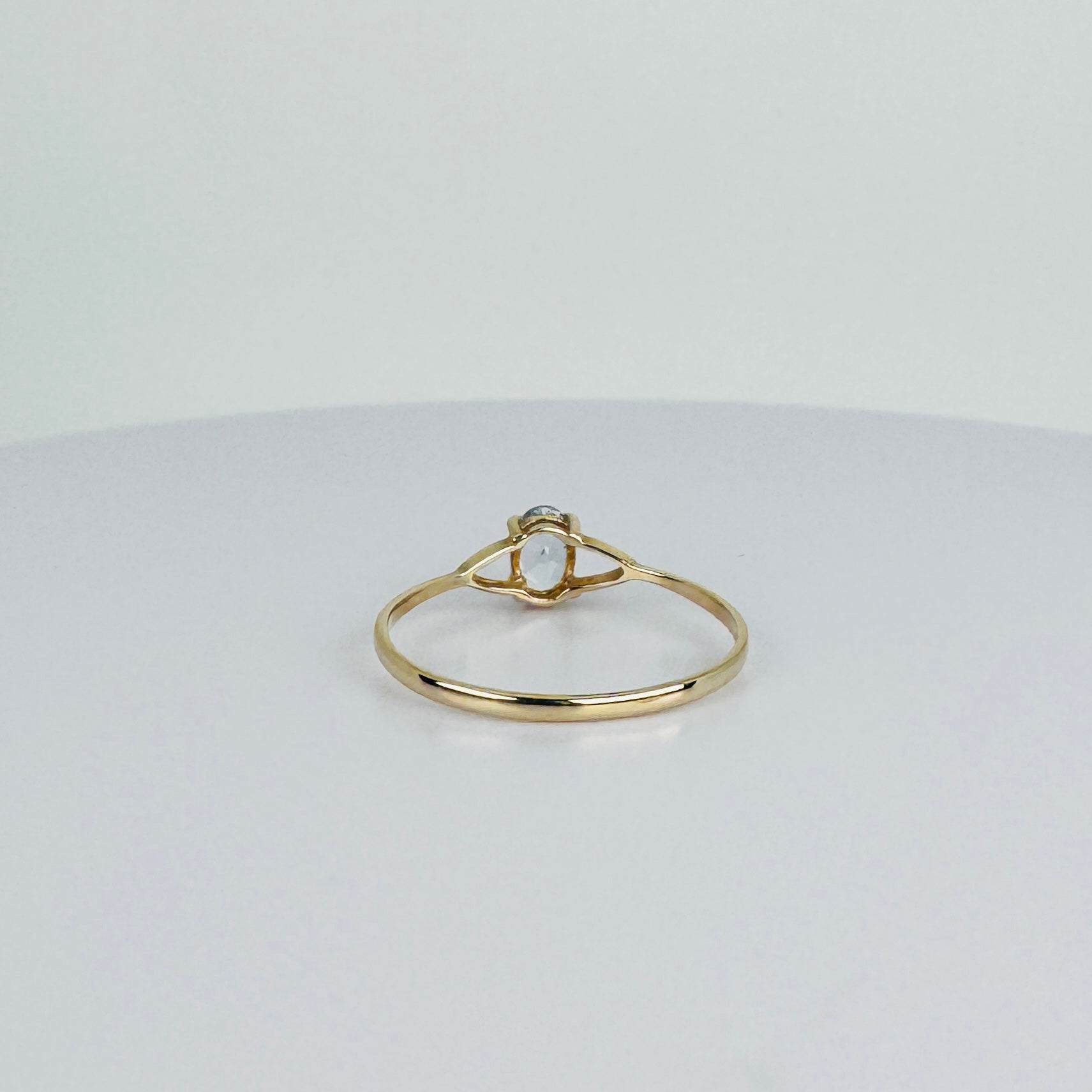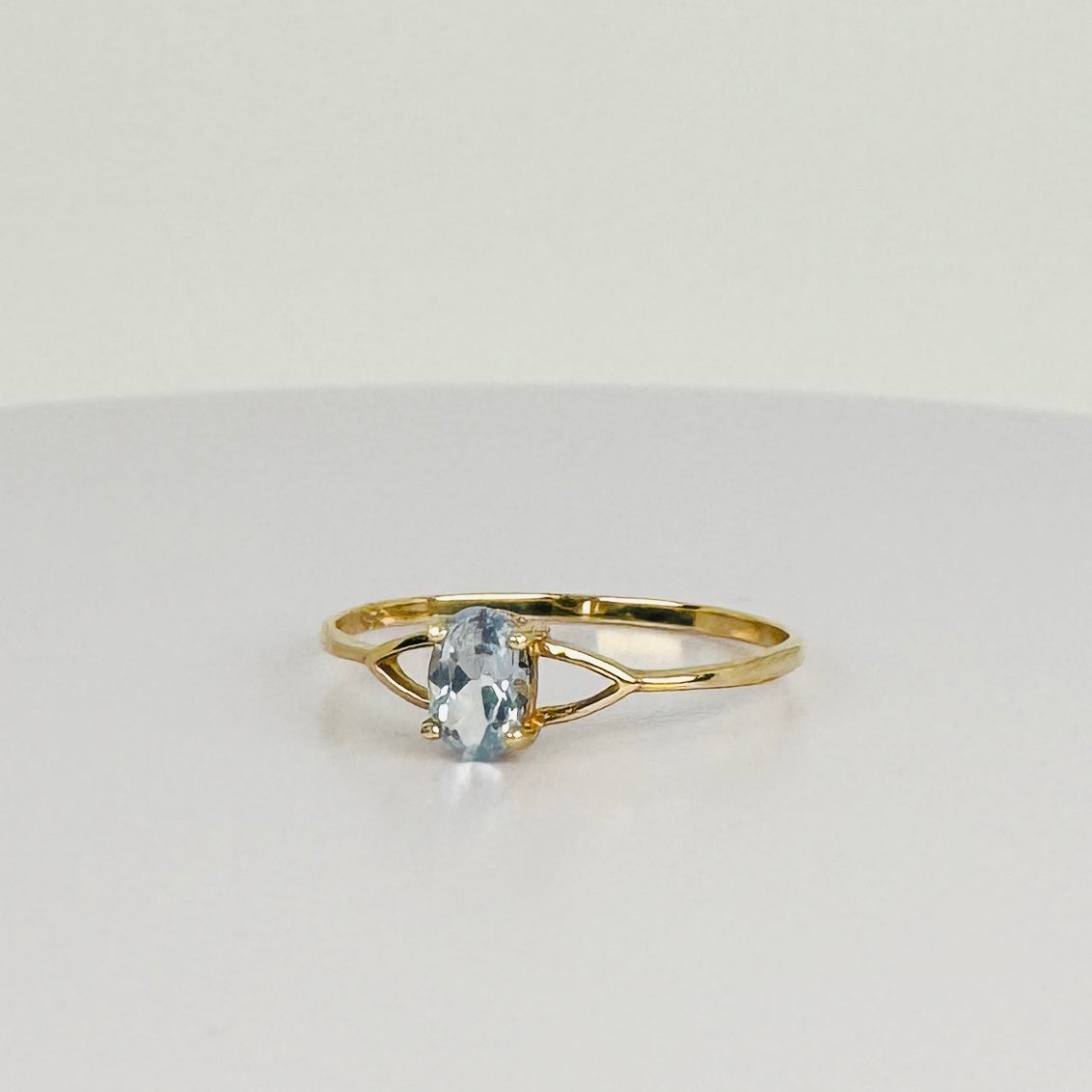 Voeg een vleugje elegantie aan je look toe met deze 14-karaats gouden ring met een prachtige ovale aquamarijn. Het ontwerp van deze ring en de lichtblauwe kleur van de edelsteen maakt dit pre-loved sieraad een lust voor het oog!