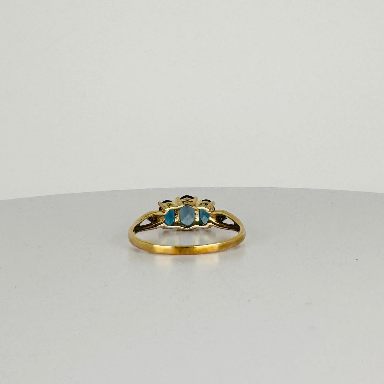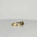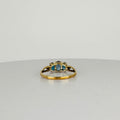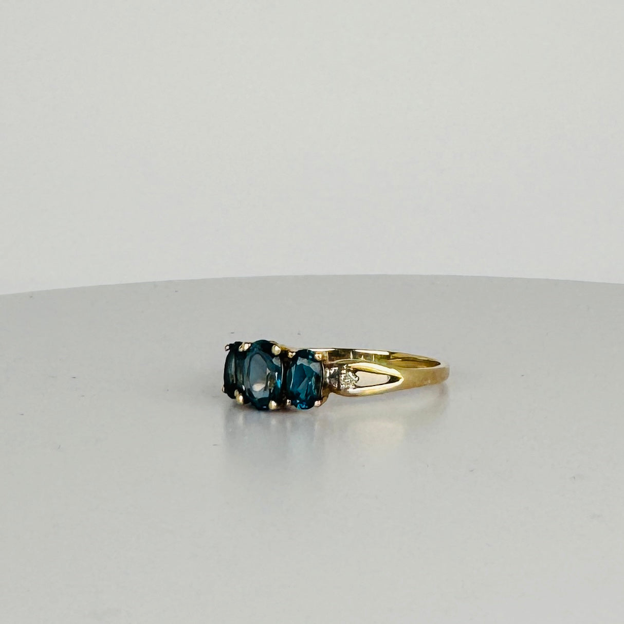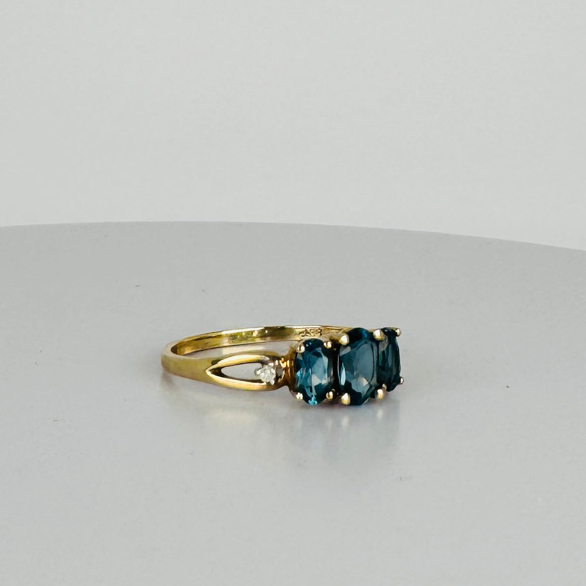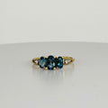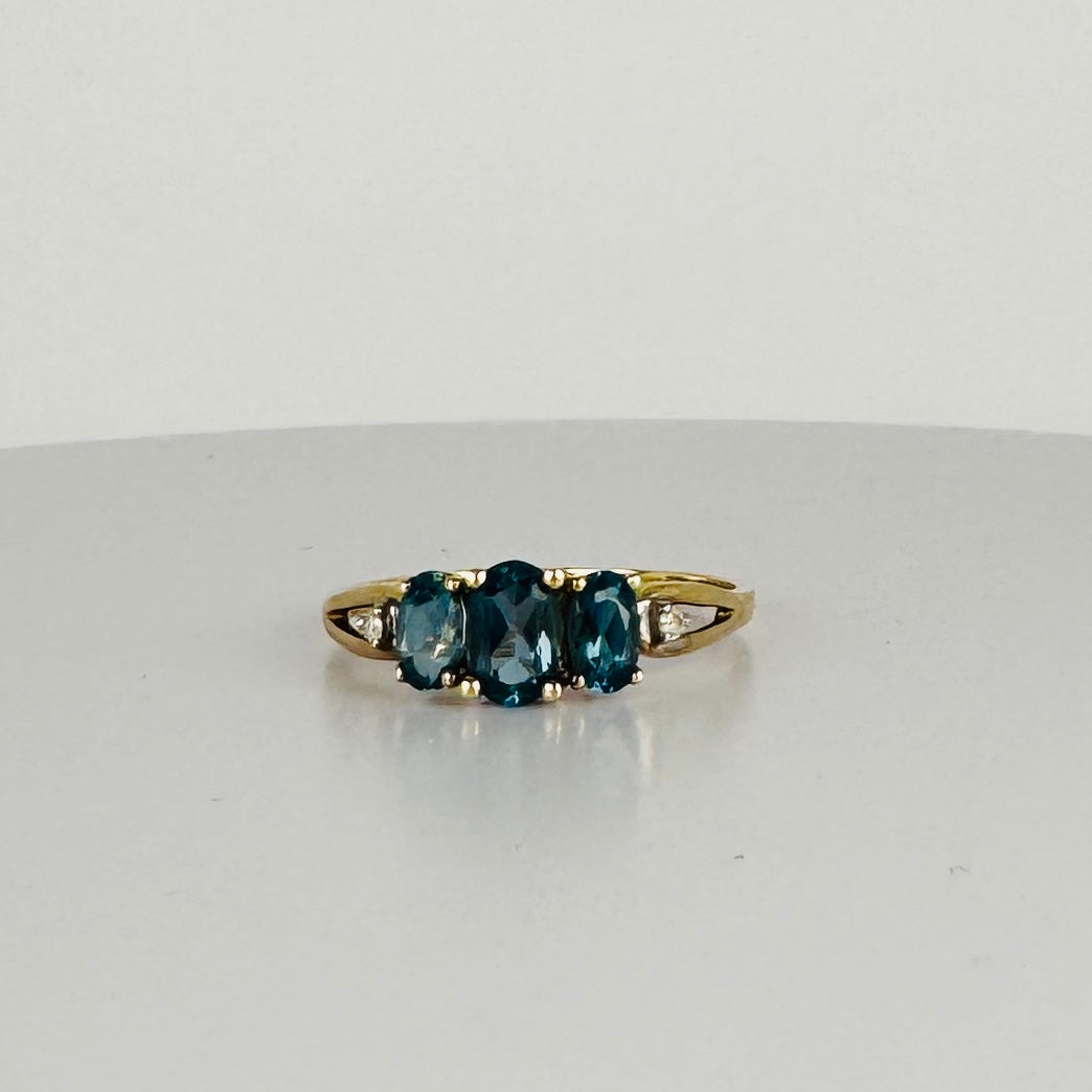 Deze prachtige vintage ring is een echte eye-catcher! Met drie schitterende London Blue Topaas-stenen straalt hij een diepe, rijke kleur uit die moeiteloos chic oogt. Daarnaast is de ring verfijnd afgewerkt met twee diamantjes voor extra sprankeling! Het tijdloze design combineert klassieke elegantie met een moderne touch!
