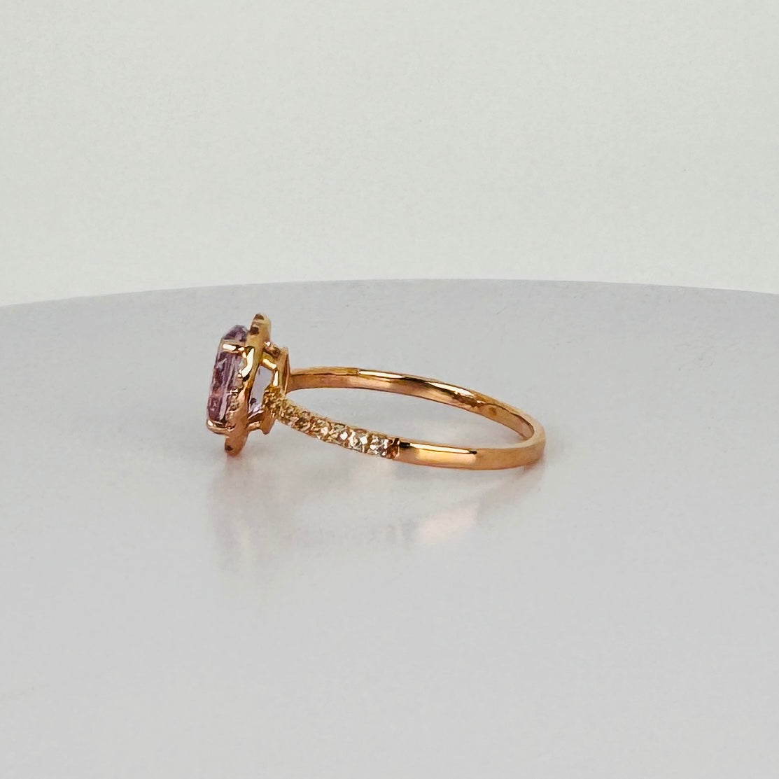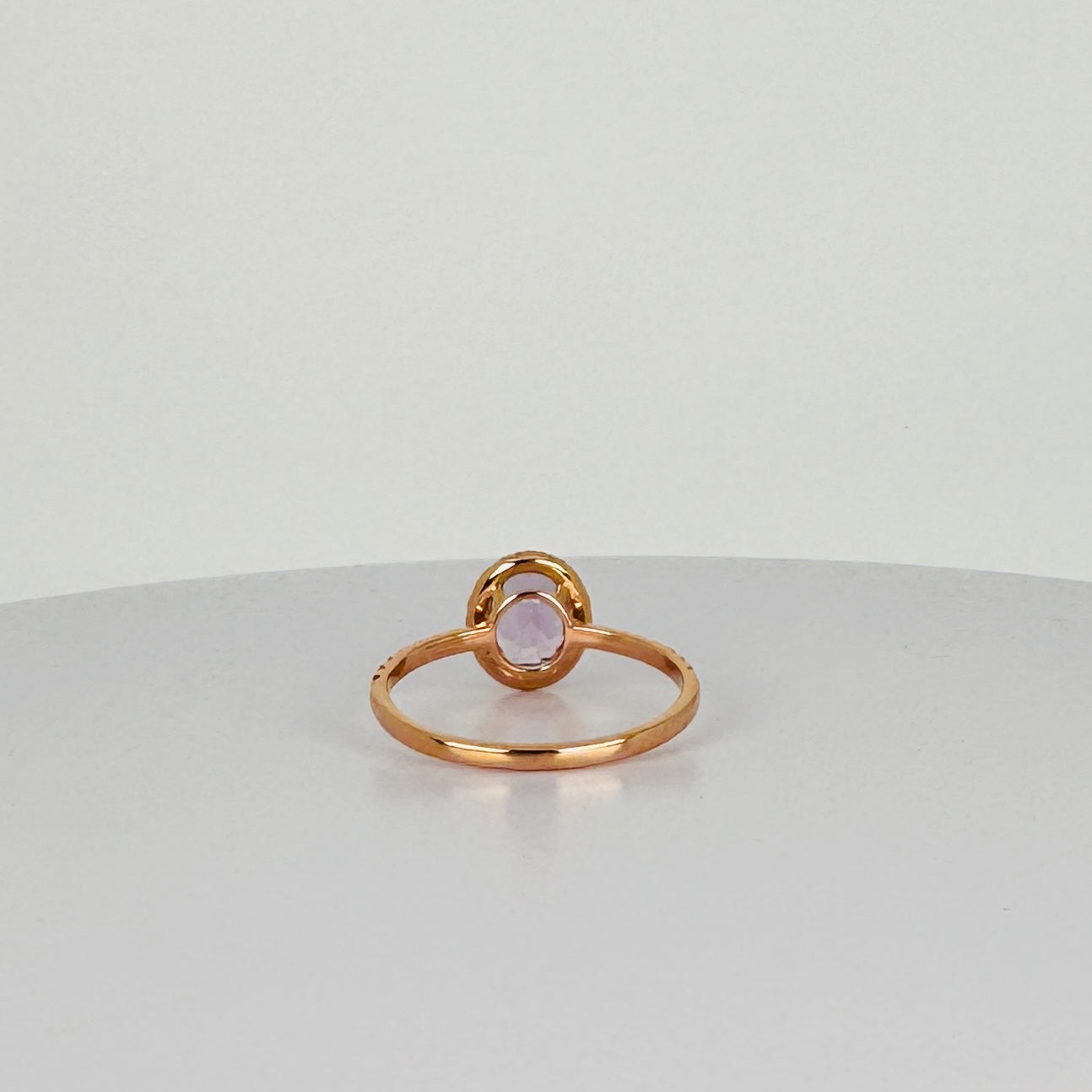 Check out the unique shape and stunning design of this 18k ring! Featuring a vibrant oval amethist surrounded with white sapphires. The band of this pre-loved jewel is also set with these beautiful sapphires. This ring is all about making a statement. Don’t miss out—add this standout piece to your collection!